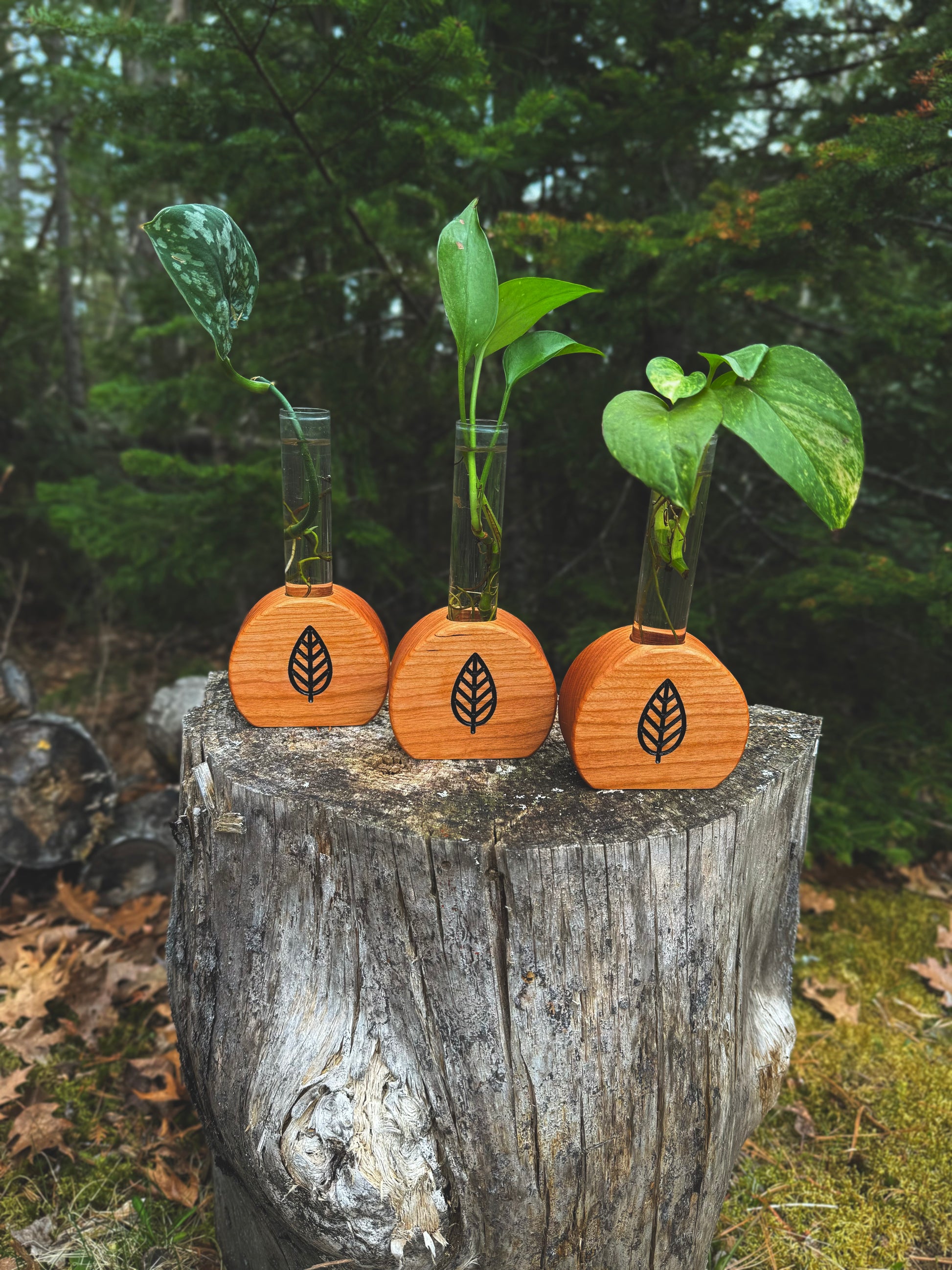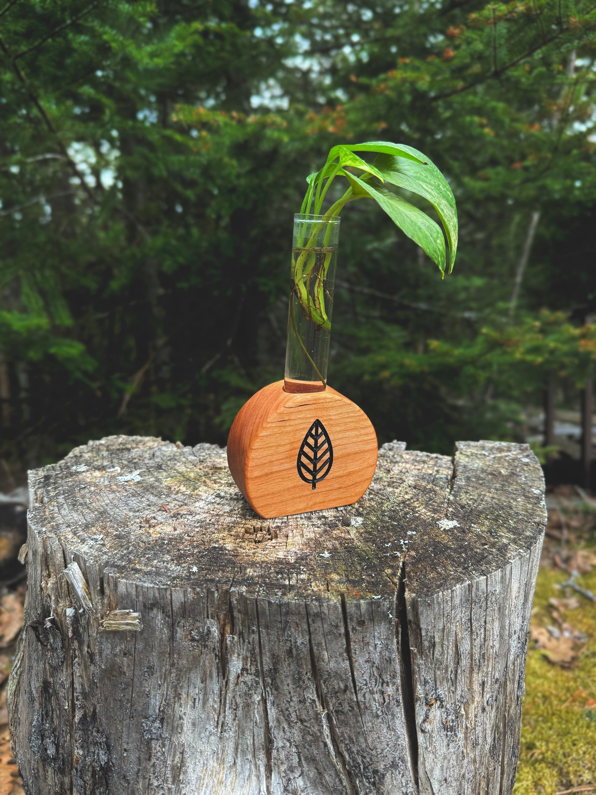 Custom leaf engraved propagation station made with a solid piece of cherry. This is the perfect sized station for that one little spot in your home/office that needs something extra! One glass tube will be included!